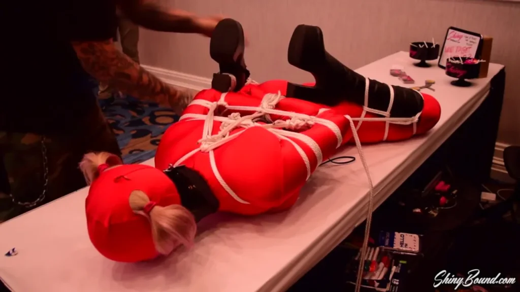 Trip Six and I did several live bondage demonstrations at fetishcon in 2016. We sure had a lot of fun meeting and talking with everyone that stopped by the booth! For this demonstration, she dressed up in a red shiny spandex zentai, a tight corset, big black leather boots, and a tall posture collar. I tied her up in an extreme boxtie/frogtie on the front table in front of an ocean of onlookers and put a name tag on her so people know whos under the hood. We kept her like that for a long time… Helpless and squirming for strangers.. I just recently re-edited and rendered this video into 1080p HD for the first time ever and its only here at ShinyBound.com!