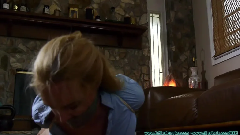 This clip starts where Part 1 ended. Miguel’s thug leaves Ariel to struggle angrily for a while before returning to bind Ariel’s elbows together. The thug taunts her a bit and explains why all of this is happening before leaving her once again to endure her toes to wrist hogtie. All she can do is struggle, moan, and angrily grunt as she tries not to choke on her own panties and socks. When the thug returns he tapes her feet to her gag. Ariel has been extremely angry and feisty uo until now. It seems this has finally broken her and she begins to accept what is happening to her. This really intensifies the strictness of her bondage and you can tell by the look on her face as she does her best to cope. At this point, Ariel the tough cop is defeated. Her blouse is ripped open and the thug taunts her again, taking pictures of her nearly nude and gagged with her own socks and panties… what will the other ops on the force think? She won’t be able to tell anyone, and her ordeal has just started. The thug makes her ask for more bondage through her gag, and the now defeated Ariel complies. I added a little bit of behind the scenes footage of Ariel being ungagged.