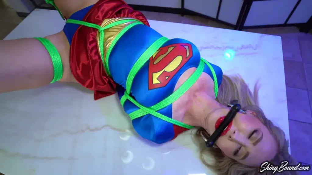 In this cosplay parody, fetish legend Kendra James takes on the role of Supergirl. Dressed in the iconic blue and red suit, she looks every bit the part of the powerful superhero. However, this time, she finds herself in a dire situation.Bound tightly in Kryptonite rope, Supergirl is trapped in the Fortress of Solitude. The very ropes that are meant to immobilize her are also draining her powers. With each passing moment, her strength diminishes, and she struggles to break free.The added twist of the Kryptonite rope between her legs only intensifies her predicament. The once invincible Woman of Steel has been reduced to just another damsel in distress, in desperate need of rescue.Frogtied on the table, Supergirl squirms and writhes, her struggles becoming more desperate as she feels her life force slowly fading away. She lets out muffled cries for help, hoping that someone might hear her (maybe with their super hearing?)But as the ropes continue to tighten and the Kryptonite drains her powers, Supergirl’s hopes begin to fade. Will she be able to break free?!As she fights against the ropes, Supergirl’s thoughts race, wondering how she could have ended up in this vulnerable state. But one thing is for sure, she won’t give up without a fight. With determination and a glimmer of hope, she continues to struggle, hoping that someone will come before it’s too late!