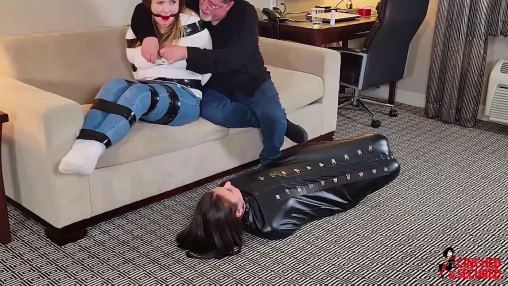 Dolly and Sarah were terrified! They’d been grabbed by an intruder whilst on vacation and now the pair are helplessly trapped! Sarah was laced into a tight, constricting leather sack and gagged with a monstrously uncomfortable cleave gag, while Dolly was taped up with constrictive electrical tape that was shrinking so quickly she felt it would crush her at any moment! Her pleas for mercy had been silenced by a huge ball gag, crammed and strapped into her mouth with agonizing severity! The two girls struggled and squirmed, Sarah flopping like a fish and kicking her legs into the air, Dolly trying to save them both by using her bare feet to undo some of the laces in Sarah’s sack in the hopes that she would then be able to free herself, but she was caught in the act by the intruder who then wrapped her feet tightly together in medical bandage! Worse still, he groped the helpless blonde before pulling her tits out of her sweater! No exposed and miserable, she struggled to the floor, hoping that she could use her fingers to undo the laces, but it was no use. Finally, all the poor, bound beauties could do was cuddle into each other for comfort, sobbing and drooling into their gags.