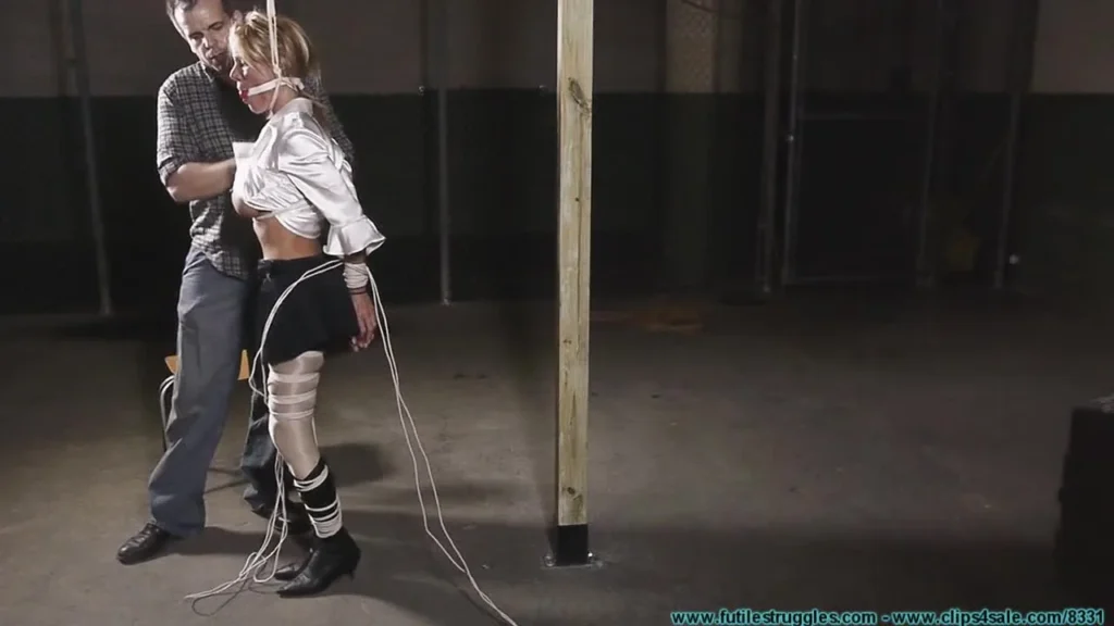 The party Girls are so easy to lure in. I easily talked her into letting me tie her wrists behind her back and then it was easy to take her to my hideout in the abandoned part of town. A petite Blue eyed Blond with Huge tits… She’ll bring a fortune on the open market. I start by wrapping one arm around her neck and then I manhandle her with my other for a bit. I then tie a rope around her neck and then tie it off overhead so she can’t get away. I then grab more rope and start binding her legs. I end up tying 4 bands around her thighs. I add rope in 3 places below her knees. I then start slapping and groping her tits through her silky white blouse as she whines and moans. I slap her ass a few times and then make her turn in a circle for me. She’s learning fast! I do tire of her questions and complaints though, so I strap a ballgag in her mouth so I can finish binding her in peace. I soon unbutton her blouse and we get a good look at her huge firm tits for the 1st time. I continue binding her upper body, adding rope above and below her them. I then decide that her shorts/skirt attire should be removed. I cut them away with a pair of scissors. I remove her neckrope and sit her in a chair. I walk away leaving her to struggle and mmmpph. When I return, I remove the ballgag then I grope and slap her tits. I then stuff a pair of panties in her mouth. I tape them in securely with clear tape. This is where Part 1 ends.