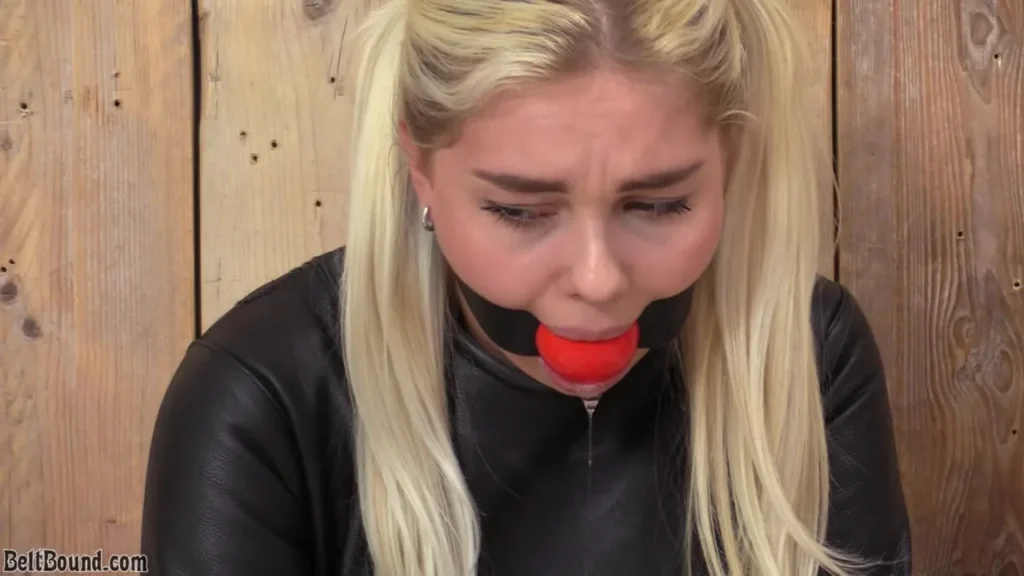 Submissive Denise is such a cutie! She is very good at pretending she hates all bondage, but she secretly gets turned on by being restrained and gagged. Her pouting face is just a test for the Dominant: if you give in, she will laugh at you for being weak. She needs a very strong Dominant to keep her restrained, someone who doesn’t fall for her sad face and pleas. I strapped her into a black leather straitjacket and a HUGE ballgag. Drooling and pouting, Denise secretly enjoyed her timeout very much!!