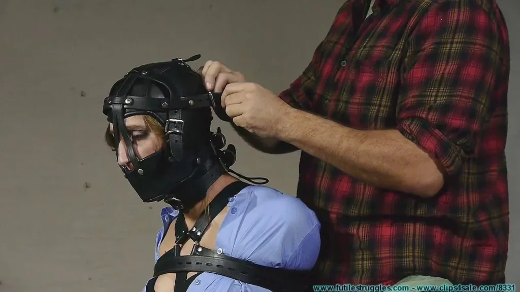 This clip starts where Part 1 ended… IR waits nervously in the chair as The Rights Activist gathers gear. He removes the tape gag and the rag that had been stuffed in her mouth. He then laces an open face hood onto her head. A large squishy ball is inserted into her mouth, before a harness muzzle is strapped onto her head as well. More straps are added to her arms and torso, as well as her legs. She is then placed on the floor where her feet are strapped and prepped for her hogtie. This is where Part 2 ends.