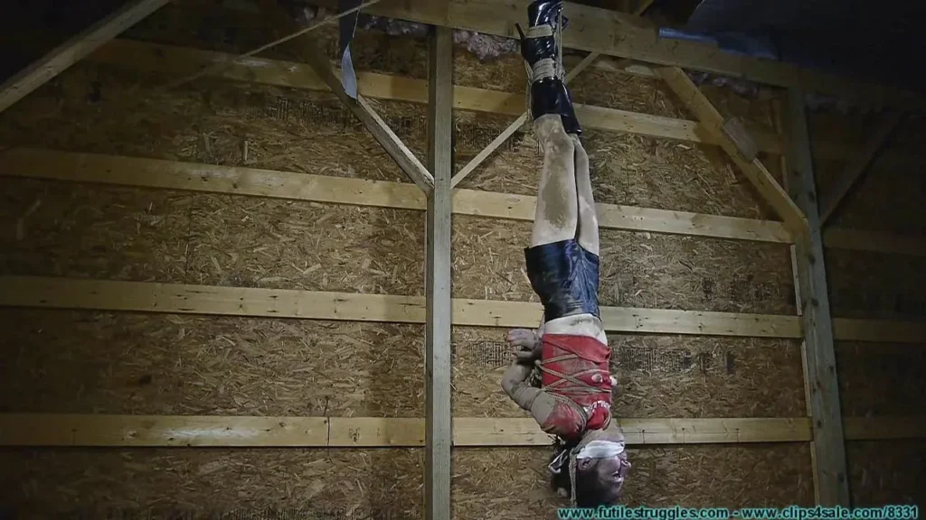 A helpless girl in a red outfit is strung up completely upside down from the rafters of a rustic wooden barn by a man in beige. She’s fully roped, blindfolded with a white cloth, then fitted with a heavy leather hood and mask while metal buckets are hung from her body for extra weight and torment. The dramatic inversion, swinging, and intense close-ups deliver extreme suspension and sensory deprivation thrills.