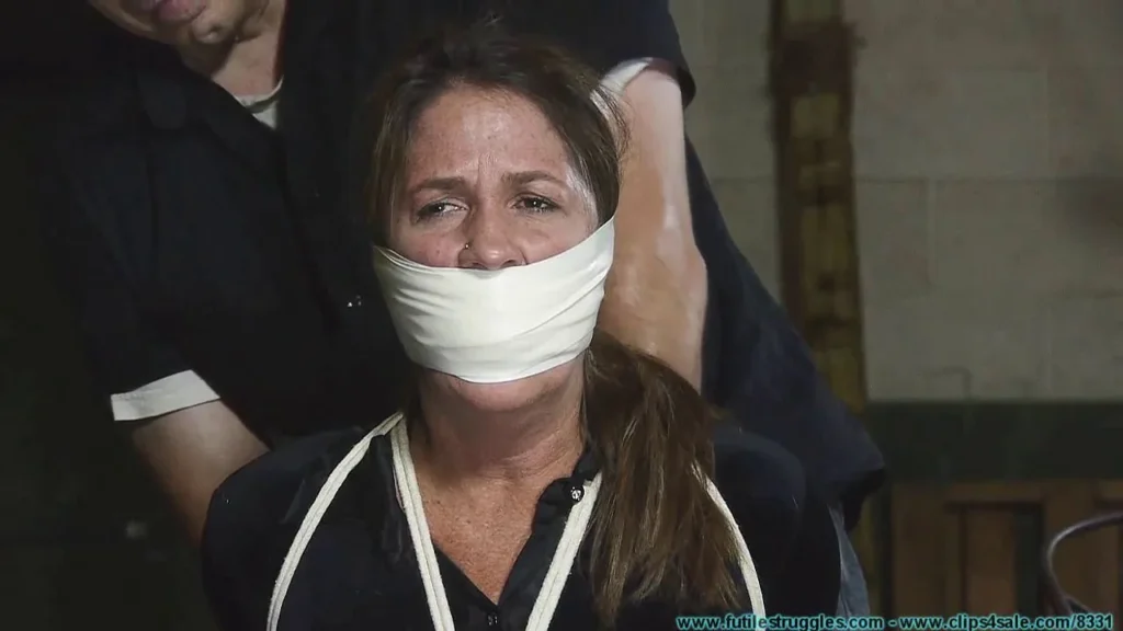 This clip starts where Part 1 ended… After getting all the tape out of Cherry’s hair, It is a mess. I grab it all and pull her head back as I manhandle her tits through her shirt. It’s time for a new gag though. This time I shove a huge ball of string in her mouth with a rope through the center. I tie the rope tightly around her neck. I leave the gag like this for a short while as I add more rope to her body. I then wrap vetwrap over top the string ball gag. Soon after, I wrap black tape, on top of the vetwrap… very effective and tight! I add more rope to her chair tie. I remove the gag after a bit. I ask her if she’s going to be quiet if I don’t regag her right away and she says yes. I continue binding Cherry to the chair. Like most women, Cherry can’t stay quiet for to long. She starts asking questions and squawking about this and that. I’m not giving her a second chance. I immediately grab a big red foam ball and shove it in her mouth. I seal it in tightly with elastic micro-foam medical tape. I continue roping her. I tie her elbows as tightly as I can and then I hike them up towards her shoulder as much as possible… making sure everything is tight. I hood her with a nylon stocking and then wrap a wide band of tape over her mouth and eyes. I wrap blue tape around her forehead and then under her chin and back up. I use the excess nylon to tie her head back. I leave her to struggle at this point. I watch her and she’s not really putting in enough effort though. I smack her feet with a thin wooden paddle and that gets her to struggle. After a while though she slows down, so I have to do it again! I sit back and enjoy watching her. At the end of the clip, I remove her gag and the clip ends.