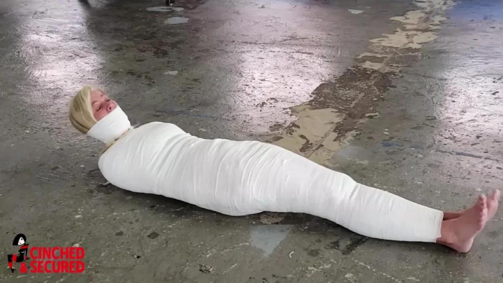 When I rented a space for a spooky party, I really wanted Dakkota’s opinion of the space. Not only was she very dismissive of it, she was convinced I could not do anything to make it more spooky for the party. How wrong she was! EVERY spooky party needs a mummy, and Dakkota fit the bill perfectly! Heavily gagged and wrapped from her shoulders to her bare feet, she groaned and “mmmppphed”, thrashing about in a useless effort to free herself as she fumed at having been turned into a mere decoration for the delight of my guests! Of course, had she known what was in store, she really would have struggled, but soon she was placed into the final position as a living party favor: mummified, gagged, and hung upside down from the ceiling! Of course, since it was to be a costume party, I simply had to disguise her identity with a tight spandex hood! Now, mewling pitifully and she swung to and fro, her cocoon twisting as she struggled, she can only hope that I did not forget to bring the pinata!