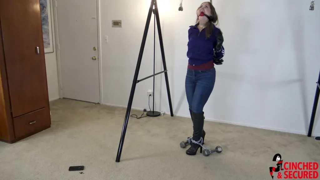 Officer Adams is in a real bind this time! With her wrists cuffed behind her back, her booted feet chained to heavy weights, and her neck fastened to a steel support by means of a rope tether, all she can do is struggle. Well, struggle and mewl and moan into the big ball gag that is turning her anguished cries into bubbling, drool-filled gurgles! She knows if she loses her balance she will be in a very dire situation indeed, but she cannot resist trying to free herself, especially with her cell phone laying just a few feet away, mocking her. Through a miracle, she manages to free the neck rope, and cautiously makes her way to the floor. She contemplates making a run for it, but knows she won’t get far with those weights chained to her feet, so she makes her way to the cell phone. With her hands cuffed behind her she’s going to have to painfully contort her arms to grab it and make the call, but she manages, ignoring the burning in her muscles. Unfortunately, the folks on the other end can make no sense of her gagged pleas, and so she is left with no alternative but to crawl to the door. Just when freedom seems within her clutches, the bad guy returns, and Rachel can do nothing but stare up at him, pleading as the drool and spit bubble around her gag. There will be no escape!