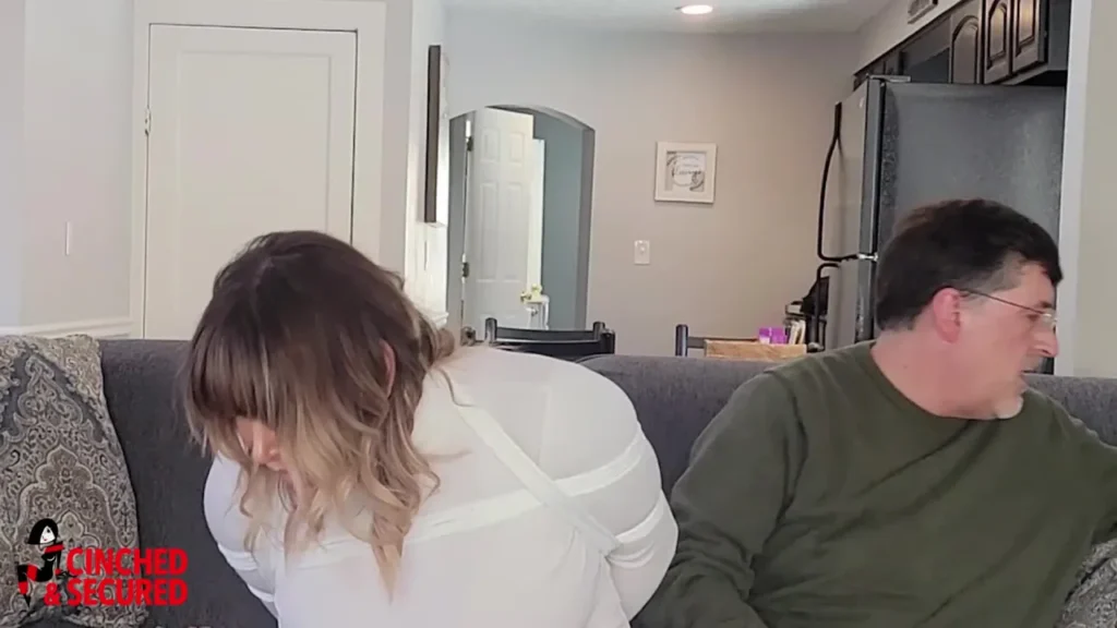 Poor Jamie! Her morning ride was suddenly cut short by a strange man who quickly bundled her away to a secret safe house where she could not possible be found! Her cries for help silenced by a piece of cloth tied tightly around her mouth, she could do nothing to stop the man from muscling her into the home. Led roughly over to the sofa,, she could only struggle as the unknown assailant finished tying her with rope around her ankles, calves and thighs as she “mmmppphhh”ed in protest. The man explained that she would be used as a bargaining chip to extort money from her very wealthy step-father, and she was expected to sit still and wait until it was time to make the call. Before leaving to prepare for the call to her step-father, the man made her gag even more effective by tying another cloth over her face and leaving her in bound and gagged terror and solitude. Knowing she had to escape, she struggled for all she was worth, eventually managing to et to her feet and hop into the next room in search of something to free herself with. Unfortunately, she was again caught by her assailant who now decided to ensure she would not be trying anything like that again! He hopped her back into the room, swapped her gag for a nasty looking contraption of rubber, leather and endless straps, and hogtied the buxom beauty on the floor! Now utterly helpless, she thrashed and screamed into the leather mass that sealed her face, hoping against hope someone would find her!