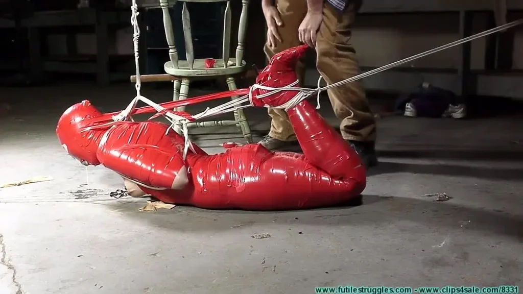 Gorgeous Rachel is transformed into a shiny red tape mummy, completely encased from head to toe in layers of glossy red tape. Placed in a tight hogtie and suspended from the ceiling, she dangles helplessly, her bound form swaying as she makes tiny, futile movements in this ultimate mummification fantasy.