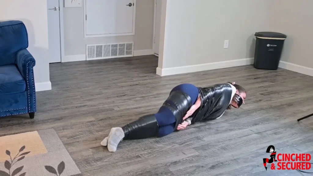 When Smitten came home from running errands she found a nasty surprise waiting for her: A burglar, who clamped a hand over her mouth and dragged her off to the bedroom for what turned out to be a true nightmare! First, he tied her up with an ungodly amount of super tight, super sticky black electrical tape, locking her legs and feet together and tightly pinning her arms and hands to her sides. Then he crammed her mouth to bursting with an old rag and sealed it in place by wrapping more of the horrible tape around her pretty little face! He left her alone while he went to finish ransacking the building, and Smitten began flopping and struggling, yelling into her gag in the misguided hope that someone, anyone would hear her. Realizing help would not be coming, she worked her way to her feet and hopped into the living room, praying she did not run into the burglar. Luck was with her and no burglar could be found, but Smitten still need to free herself. She crawled inchworm style across the floor and into the kitchen where she managed to get to her feet by slowly and painfully pushing her body up the refrigerator. Hopping about, she searched for a tool to cut herself free but her search was interrupted by the return of the burglar! He grabbed her, clamped a hand over her mouth, and hopped her into the living room where he mummified her in an ultra thick, ultra tight cocoon of the dreaded tape! Now there was truly no chance of escape! All the poor girl could do was struggle, grunt and wiggle her sock-covered feet uselessly!
