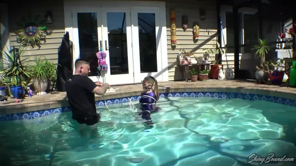 Sexy Lexi Lane dips her spandex covered toes into the crystal clear pool. The water feels nice.. She steps in up to her knees. Her leggings turn dark as the water soaks the silky material. She moves further into the pool. The water is now up to her waist. She caresses the water and gently splashes herself, further wetting her leotard.. Shiny enters the pool and ties her hands and elbows behind her with some tight wet nylon rope, and then ties a chest harness. He fits her mouth with a tight ballgag. He sits her on the steps and ties her submerged legs together. He walks to the other side of the pool and tells her to hop over to him. She bobs up and down in the water and playfully makes her way over to him. He fondles her breasts and feels up her wet spandex legs and breasts. He ballties her on the steps and then leaves her to try to escape the heavy water soaked ropes. The gentle sounds of water circulating her helpless body are very soothing..