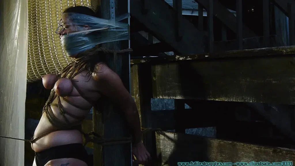 This clip starts where Part 1 ended… The man tightly binds Summer’s tits with the thin biting twine. Summer has no idea why he starts pounding nails into the post around her head. It’s probably best that she doesn’t. She soon finds out though when the man attaches hooks to the nail and then hooks her nostrils. It’s just a tease of what is coming. He removes them and tapes her head completely to the post with clear tape. The nose hooks are applied again. Now he tries to apply heavy clamps to her nipples, but between how tight her tits are bound and her sweaty body, they won’t stay. Summer still whimpers and yelps as the man tries for several minutes. He then hooks her side nostrils and attaches them to the nails he hammered into the post earlier. He then tightens Summer’s crotchrope even more! She is left to endure her tight bondage as the man watches her as he sips a beverage. She moans, mpphs, and whimpers, but there’s not much else she can do. As darkness falls, the man starts to untie her. He’s going to let her in the house for the night, as she has chores to do. After he has her untied from the post, he orders her to her knees with her arms behind her back. In a few minutes she is allowed to put her hands out in front of her so she can crawl to the door.