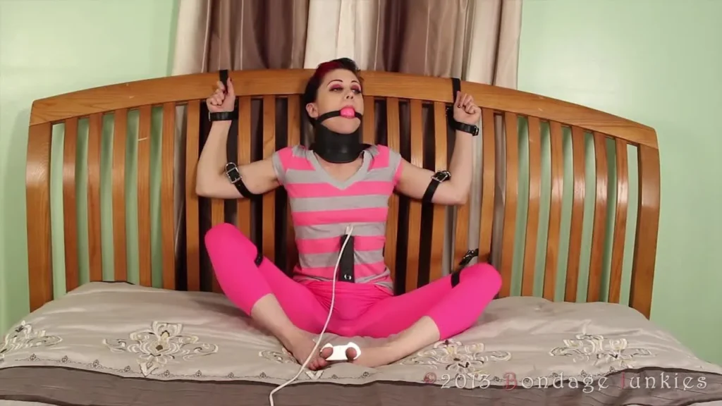 To say Viorica was stuck would be an understatement. With her tendency to try an escape I knew I couldn’t leave anything to chance. While she thinks I’m just out to make her secure I have a plan in mind. I start by belting her wrists and arms to the headboard with more on her legs pulling them wide apart. A gag and posture collar are next with a strap across the collar to be sure she can’t get leverage. I finish off her toes with a set of thumbcuffs and let her squirm for a bit. When I didn’t think she was squirming enough there’s one way to fix that. A vibe stuffed down the front of her yoga pants. One thing’s for sure, Viorica’s got the headboard creaking now!