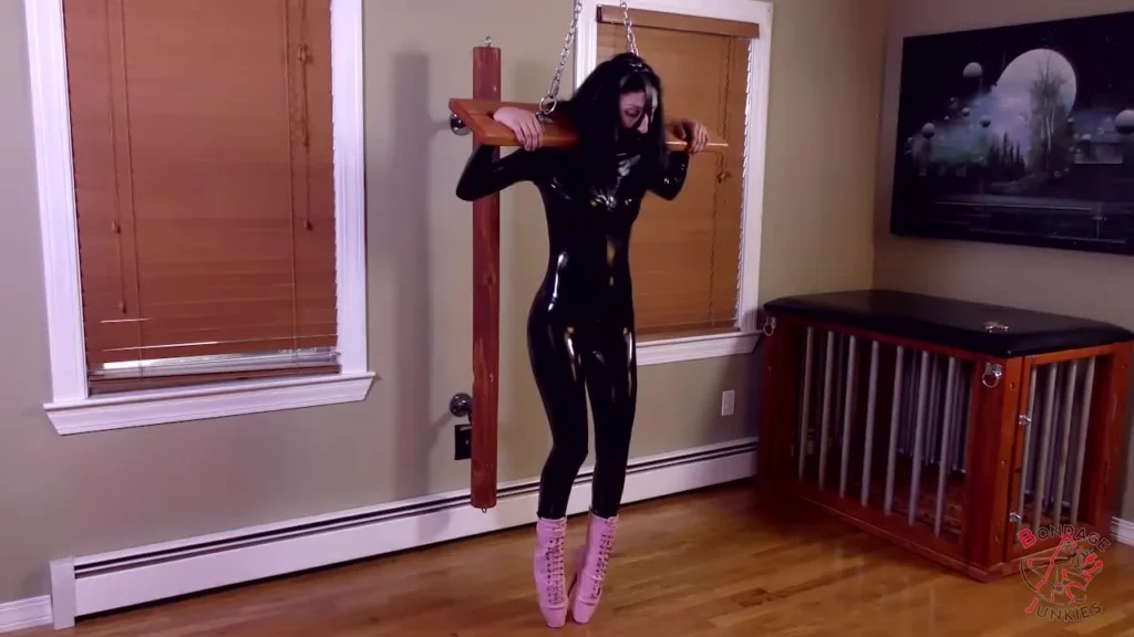 Amie spends the afternoon testing out her new toys and gets a bit more than she bargained for. Starting with ballet boots and ending with her head and arms in wooden stocks, her predicament is obvious. It won’t take long before her legs and toes need a break but the stocks won’t let her. Struggling as hard as she can, the magnetic seal holding the stocks together is simply too strong. Her only recourse is to accept her fate and learn to stand in her new boots for a very. long. time.