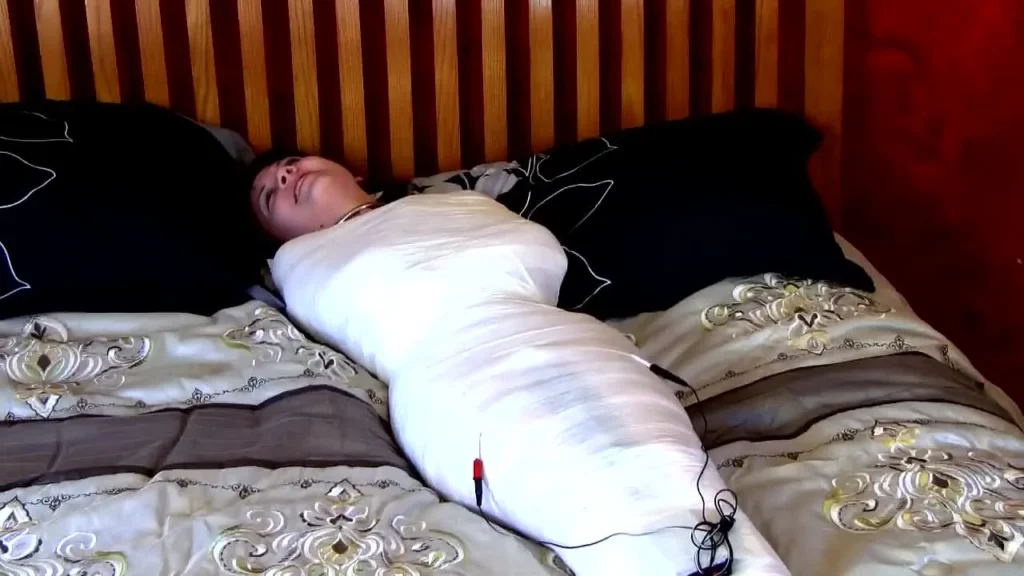 A few months back I had a simple plan for Viorica to mummify her and watch her struggle. All went well until she went and escaped! I simply could not let this slide so I invited her over for a little rematch. After applying the first layer of plastic she was still pretty confident but changed her tune after a couple layers of vetwrap went on. Under it all was a Hitachi and set of TENS pads. Once the vibe and TENS microphone were turned on Viorica finally realized the trouble she was in. With the TENS cranked up she tries her best to keep quiet as she struggles in her cocoon. It’s not until I crank up the Hitachi and leave her trapped in a world of pleasure and pain, futilely fighting to get free.