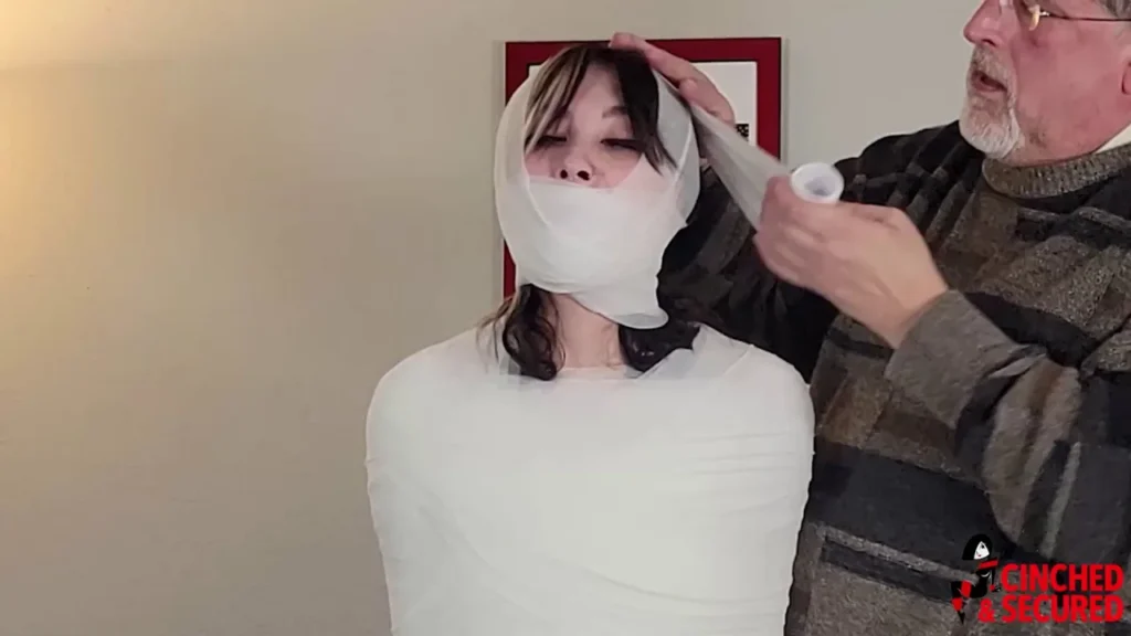 It’s always a treat when I get to mummify someone for the first time. For the uninitiaed, mummies are ultra diabolical! Usually, the subject is a little bit nervous, and Medusa was no exception! She put on a brave front, but her confidence slowly eroded as the wrappings swallowed her body, inch by inch, transforming her into little more than a wriggling, “mmmmmppppphhh”ing worm! This time, we added something special to the mix: An endurance challenge! If only Medusa had known that the challenge meant she would have to endure her super tight cocoon and gag until she could free herself, because I certainly wasn’t going to help! I’m not a total monster, though, so I did leave a pair of scissors nearby, but wth her entire body save her eyes and nose trapped in the gleaming white prison, I don’t think she’ll be escaping any time soon!
