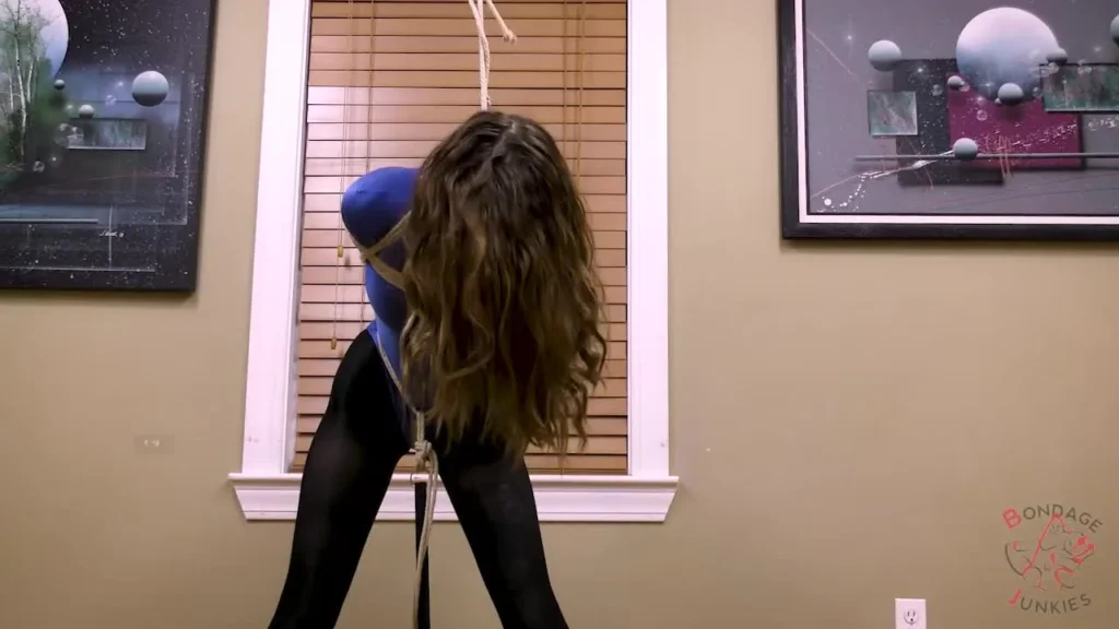 Sugar wasn’t sure what the black rod tied to her crotch rope was but was sure it wasn’t to her benefit. The 50-pound weight at the other end wasn’t very promising either. With her legs tied apart, her suspicions were confirmed as the actuator closed pulling her into a crouch. Try as she might, Sugar couldn’t muster the willpower to pull up 50 lbs of weight by her crotch rope. It doesn’t take long before her legs start to shake and just when she’s on the verge of collapsing she’s given some slack. Her reprieve doesn’t last long before she hears the whine of the motor again.
