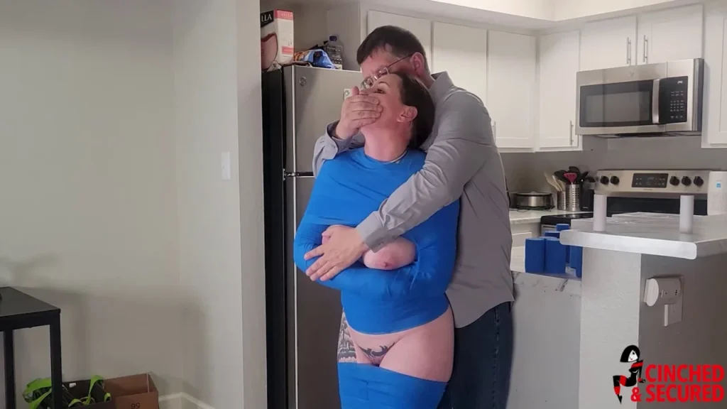 Minx wanted me to mummify her for a bit of play time and I was happy to oblige, although things turned far more intense than she expected! I started slowly (gotta warm up your partners) by wrapping her nice and tight, leaving her gorgeous tits and magnificent ass and pussy free. When I clamped a hand over her mouth and pressed into her, her eyes rolled and crossed as sub-space started to kick in. A few bites to her neck left Minx gooey and a fog-brained, dripping puddle! Time for a little sensory deprivation! I encased her head, leaving her nose free (always gotta let your toys breathe) but robbing her of sight and speech (unless you count lustful moans as speech!) A little tape tightly gagging her mouth was a nice touch, and now it was time for play time to really begin! I brought out a heavy leather strap and begin strapping that delicious ass of hers, stopping to rub and fondle it while whispering into her covered ears. I then moved on to a heavy wooden paddle, her least favorite implement, but now it was time for what I wanted. With her bottom on fire, I leaned in and began dry humping that stinging ass as she moaned. Next, I fingered her dripping pussy until she was panting and moaning and begging to be fucked, by she would have to earn that privilege! I told her to get up on her tip toes and stay that way until I returned, and being the good girl she is, she complied. Now let’s see how long she can stay that way!!!